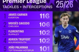體育資訊2月10日訊 squawka統(tǒng)計了本賽季英超球員的搶斷+攔截情況,詹姆斯·加納力壓凱塞多居首。