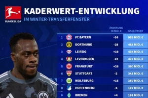 體育資訊2月11日訊 德國轉(zhuǎn)會市場列出了德甲球隊冬窗之后的身價排名,拜仁9.65億歐居首,多特4.83億歐次席。