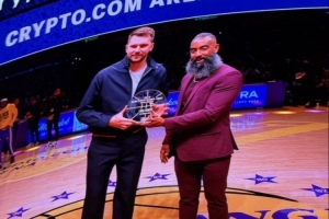 湖人主場迎戰(zhàn)馬刺,賽前東契奇領(lǐng)取了1月的月最佳球員獎杯。