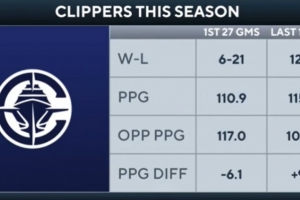 快船前27場 戰(zhàn)績6勝21負(fù) 場均得分110.9 場均失分117.0 場均凈勝分-6.1