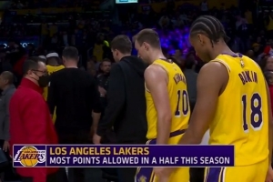 上半場,殘陣湖人讓對手轟下84分,創(chuàng)下球隊(duì)本賽季半場失分紀(jì)錄。