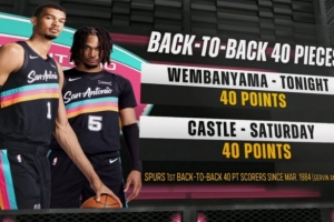 上一場戰(zhàn)勝獨(dú)行俠,卡斯?fàn)柨诚?0分12籃板12助攻。這是馬刺自1984年的格文和邁克·米切爾以來,首次出現(xiàn)連場不同球員砍下40+的情況。