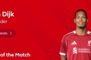 本場比賽范戴克打進(jìn)全場唯一進(jìn)球,賽后也當(dāng)選英超官方球迷票選全場最佳球員。