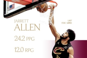 體育資訊2月13日訊 今日,騎士官方在社交媒體曬出了球隊(duì)中鋒賈勒特·阿倫過(guò)去5場(chǎng)比賽的數(shù)據(jù)。
