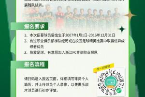 體育資訊02月13日訊 浙江FC宣布對2007-2016年齡段梯隊(duì)進(jìn)行補(bǔ)強(qiáng)選拔,并公開了報(bào)名流程。