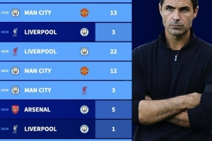 本賽季,阿森納領(lǐng)先曼城4分
