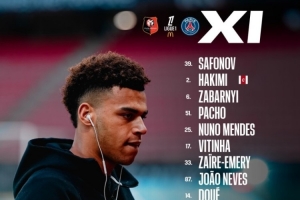 巴黎首發(fā):39-薩福諾夫、2-阿什拉夫、6-扎巴爾尼、51-帕喬、25-努諾·門德斯、17-維蒂尼亞、33-扎伊爾·埃梅里、87-若昂·內維斯、14-杜埃、7-克瓦拉茨赫利亞、10-登貝萊