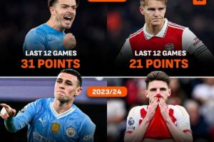 對比聯(lián)賽最后12輪的戰(zhàn)績,22/23賽季,曼城31分阿森納21分。23/24賽季,曼城32分阿森納31分。24/25賽季,曼城27分阿森納21分。