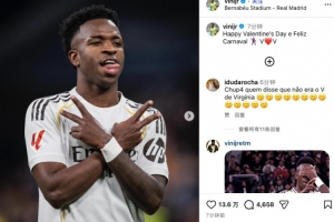 賽后維尼修斯更新社媒,曬出自己慶祝動(dòng)作并配文寫道:“情人節(jié)快樂(lè),盡情狂歡吧!”
