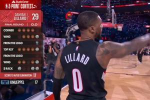 第二位出場的利拉德依然延續(xù)了首輪的炸裂手感,中圈5個點全中拿下29分的高分;