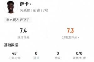 體育資訊2月16日訊 阿森納在本輪足總杯4-0大勝維岡競技,薩卡本場數(shù)據(jù)如下: