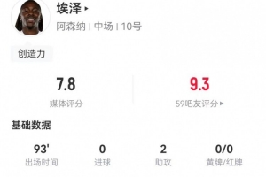體育資訊2月16日訊 阿森納在本輪足總杯對(duì)陣維岡競(jìng)技,埃澤本場(chǎng)數(shù)據(jù)如下: