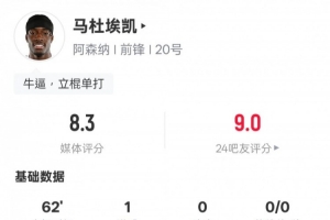 體育資訊2月16日訊 足總杯第4輪,阿森納主場迎戰(zhàn)維岡競技。馬杜埃凱首發(fā)出戰(zhàn),打進1粒進球,送出4次關鍵傳球,3次過人成功,評分8.3。