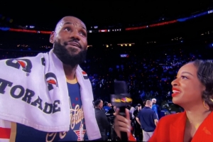 體育資訊2月16日訊 NBA全明星正賽循環(huán)賽,美國星條隊(duì)42-40險(xiǎn)勝美國新星隊(duì),詹姆斯賽后在場邊接受了媒體采訪。