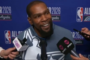 體育資訊2月16日訊 NBA全明星正賽冠軍賽,美國(guó)星條隊(duì)21-47不敵美國(guó)新星隊(duì)。賽后,杜蘭特接受了記者采訪。