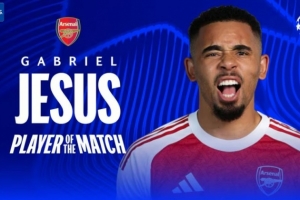 梅開(kāi)二度,歐冠官方:熱蘇斯當(dāng)選阿森納3-1國(guó)米全場(chǎng)最佳球員