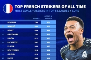 法國球員參與進(jìn)球排名(五大聯(lián)賽+杯賽):
