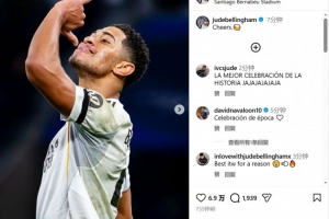 體育資訊1月21日訊 歐冠聯(lián)賽階段第7輪,皇馬6-1大勝摩納哥。賽后,皇馬中場(chǎng)貝林厄姆在社交媒體曬圖,慶祝球隊(duì)獲勝。