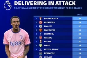 體育資訊2月18日訊 《轉(zhuǎn)會(huì)市場(chǎng)》統(tǒng)計(jì)了本賽季英超各隊(duì)中鋒+邊鋒進(jìn)球情況,伯恩茅斯力壓布倫特福德居首。