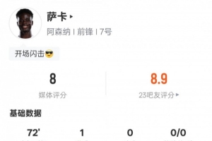 體育資訊2月19日訊 英超第31輪,阿森納客戰(zhàn)狼隊。薩卡首發(fā)登場,打進1粒進球,5次過人均成功,送出1次關(guān)鍵傳球,評分8.0。