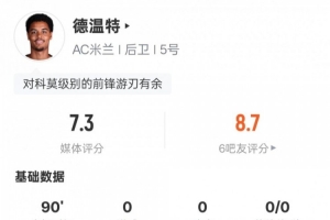 體育資訊2月19日訊 意甲第24輪,AC米蘭1-1戰(zhàn)平科莫。德溫特首發(fā)出戰(zhàn),觸球95次,6次搶斷,7次對抗成功,均為全場最多,傳球成功率達(dá)到97.6%,評分7.3。