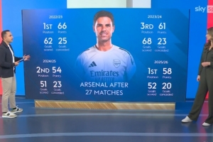 阿森納本賽季英超27輪比賽戰(zhàn)績(jī)17勝7平3負(fù)積58分,天空體育統(tǒng)計(jì)了阿森納近4個(gè)賽季的同期數(shù)據(jù)。
