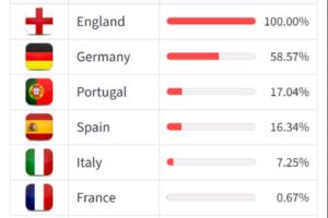 意大利則遭遇完全相反的走勢,3場比賽全敗,讓他們整體概率暴跌20%,目前只有7%的概率。
