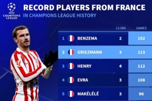 體育資訊2月19日訊 馬競在本輪歐冠3-3戰(zhàn)平布魯日,格列茲曼在歐冠出場數(shù)也超越亨利,成為法國球員歷史第二人。