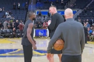 賽前熱身環(huán)節(jié),勇士新援波爾津吉斯來到場地中央,和前隊友杰倫·布朗寒暄幾句。