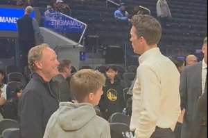 賽前,目前賦閑在家的冠軍教練布登霍爾澤出現(xiàn)在場邊,和勇士總經(jīng)理鄧?yán)S交流。