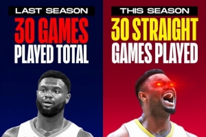 體育資訊2月20日訊 據統(tǒng)計,錫安賽季至今共計出場40場比賽,且已經連續(xù)出場了30場比賽。