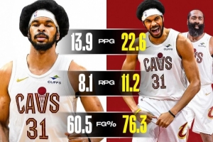 本賽季無(wú)哈登時(shí),賈勒特·阿倫場(chǎng)均13.9分8.1籃板,投籃命中率60.5%,真實(shí)命中率64.5%;