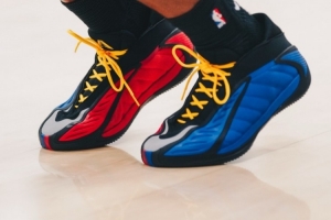 今日愛德華茲上腳了昨日訓(xùn)練時曾上腳的鞋款——AE 2 堪薩斯大學(xué)PE。這個配色采用了陰陽紅藍配色,鞋后跟有堪薩斯大學(xué)的吉祥物Jayhawk(松鴉鷹)。