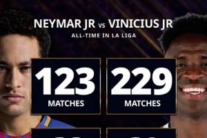 體育資訊2月21日訊 維尼修斯在西甲比賽中打進69球,超越內(nèi)馬爾,環(huán)球足球獎對比了兩人的西甲數(shù)據(jù)。