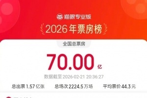 體育資訊02月21日訊 據(jù)央視新聞,網(wǎng)絡(luò)平臺(tái)數(shù)據(jù),截至2月21日20時(shí)30分,2026年年度電影總票房(含預(yù)售)突破70億!