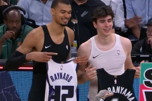 賽后,國(guó)王中鋒雷諾和好友文班亞馬交換球衣。