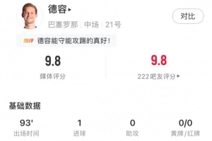 本場比賽荷蘭中場弗蘭基?德容為巴薩首發(fā)踢滿全場,全場比賽他不僅完成破門,還成為球隊(duì)的節(jié)拍器,傳球多達(dá)116腳的同時,傳球成功率高達(dá)97%。最終他獲得了9.8分的全場最高評分。
