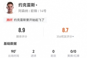 體育資訊2月23日訊 阿森納在本輪英超對(duì)陣熱刺,約克雷斯本場(chǎng)數(shù)據(jù)如下: