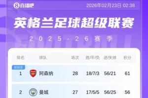 體育資訊2月23日訊 英超第27輪,熱刺1-4阿森納,最新的積分榜形勢如下。
