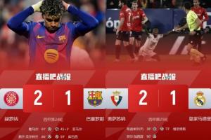 而上輪西甲,巴薩也是在客場1-2遭赫羅納絕殺,早些時候4-1戰(zhàn)勝皇家社會的皇馬登頂。