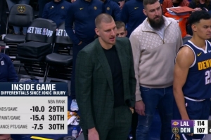 約老師缺陣后 掘金場(chǎng)均籃板減少10個(gè) 場(chǎng)均內(nèi)線得分減少15.4分 場(chǎng)均二次進(jìn)攻得分減少7.5分