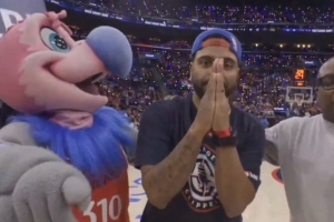 比賽間歇時快船主場舉行球迷互動活動,一名身穿快船球衣的球迷中圈投籃命中,贏得1萬美元!