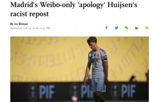 體育資訊02月23日訊 《環(huán)球時(shí)報(bào)》英文版網(wǎng)站發(fā)文報(bào)道了赫伊森轉(zhuǎn)發(fā)辱華內(nèi)容的事件,文章的標(biāo)題為《中國球迷對皇馬僅在微博發(fā)布的"道歉"表示不滿,此前赫伊森轉(zhuǎn)發(fā)種族歧視內(nèi)容》。