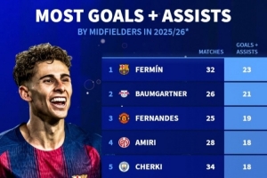 體育資訊2月24日訊 《轉(zhuǎn)會市場》統(tǒng)計了本賽季五大聯(lián)賽中場球員在各項賽事直接參與進球情況,費爾明領跑。