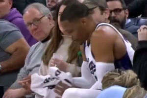 GIF-威少沖出界外 踩爆了場邊的啤酒瓶 酒花飛濺