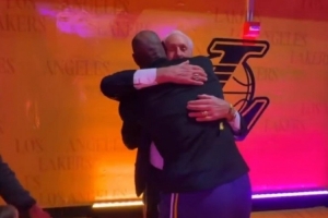 萊利湖人雕塑之日,詹姆斯和萊利擁抱。