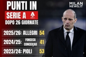 體育資訊2月24日訊 本賽季AC米蘭在前26輪意甲過后積分54分,此數(shù)據(jù)比上賽季同期提升明顯,以下為近幾個賽季AC米蘭在26輪后同期積分情況: