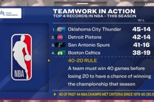 40-20奪冠定律:一支球隊必須在輸?shù)?0場比賽前贏得40場勝利,才有可能贏得當(dāng)賽季總冠軍。