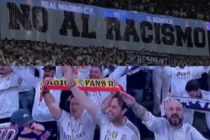 皇馬球迷賽前在伯納烏拉起橫幅,反對(duì)種族歧視