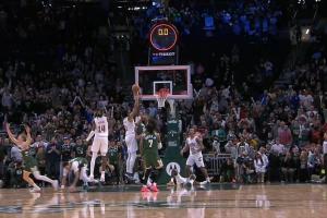 騎士最后一攻不暫停,施羅德帶球上籃丟了,但是阿倫拿到前場(chǎng)板勾手打進(jìn),可惜超時(shí)了。